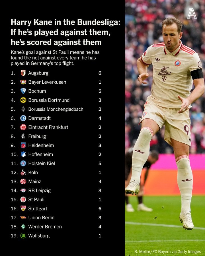 凱恩2年殺穿德甲球隊:對奧格斯堡&斯圖加特6球,對波鴻&基爾5球 3月30日訊 拜仁本輪德甲3-2擊敗圣保利,凱恩破門,這是他本賽季的第22個聯(lián)賽進(jìn)球,同時憑借這個進(jìn)球,凱恩對自己在德甲遇到過的所有對手都取得了進(jìn)球。2023年夏天加入拜仁后,凱恩在德甲一共面對過19 2025/03/30