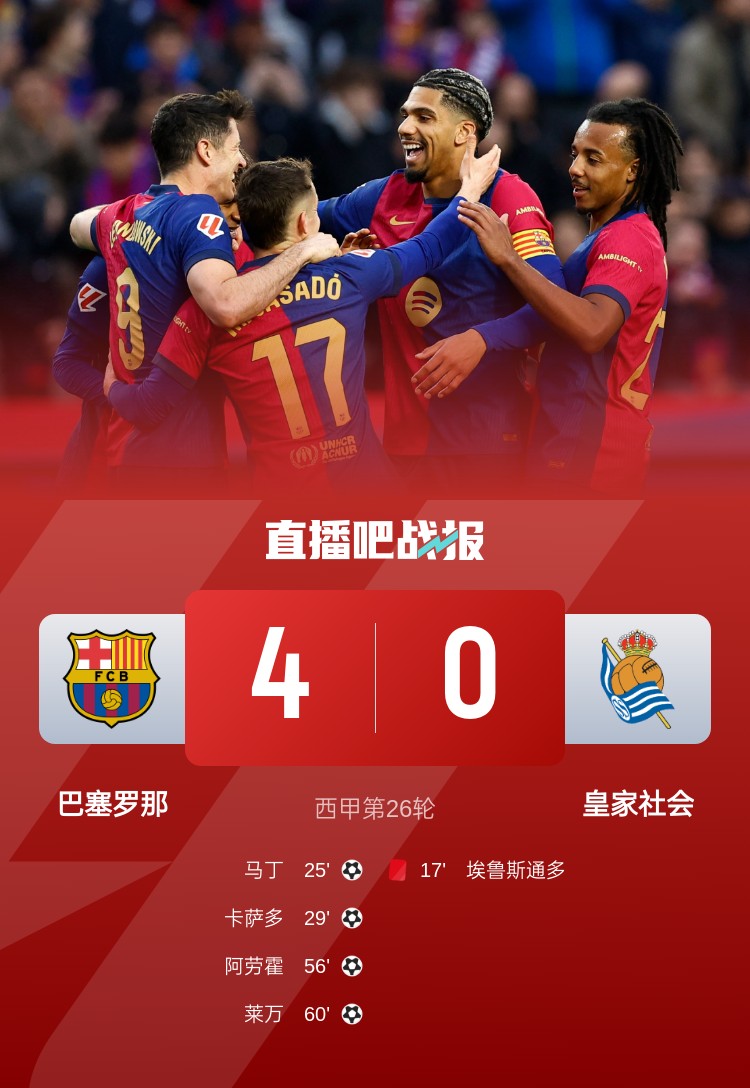 西甲第26輪,巴薩4-0橫掃十人皇家社會(huì),阿勞霍傳射,萊萬進(jìn)球。