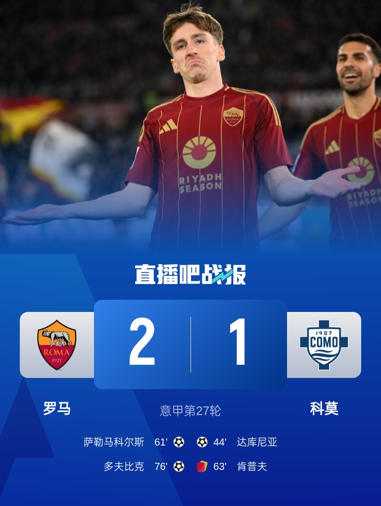 意甲第27輪,羅馬2-1逆轉(zhuǎn)科曼,薩勒馬科爾斯、多夫比克進(jìn)球。